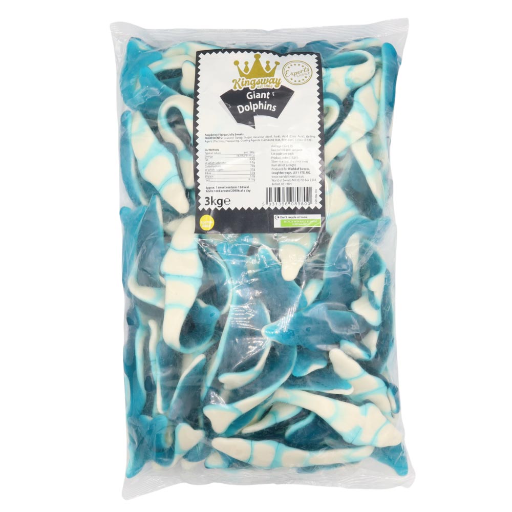Raspberry flavoured jelly sweets with a soft foam bottom, in the shape of a dolphin.